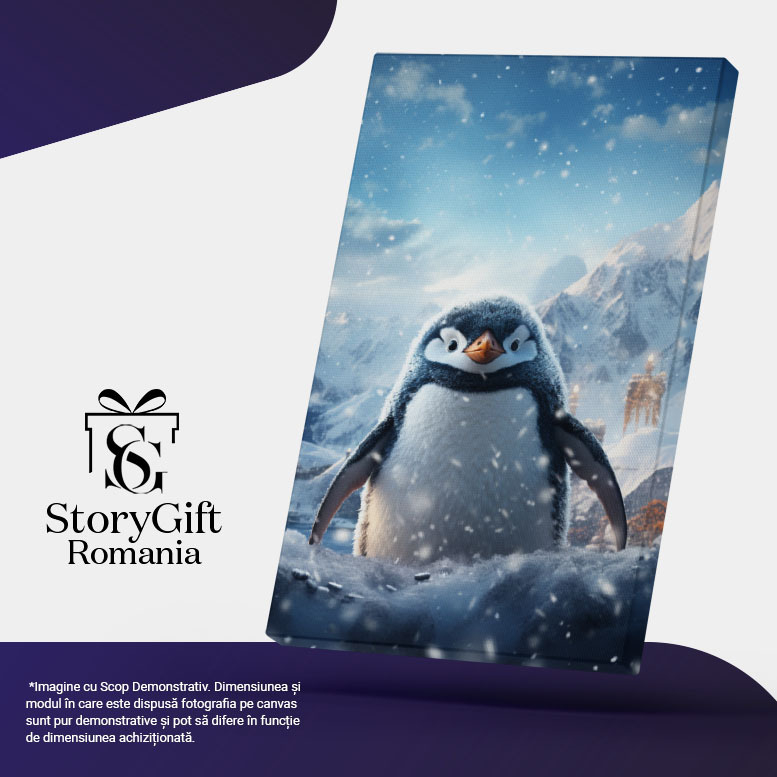 Tablou Canvas: Pinguinul Inzapezit Acoperit de Fulgii de Ninsoare cu Ciocul Portocaliu si Ochii Mirati Pictura Digitala 40x25CM