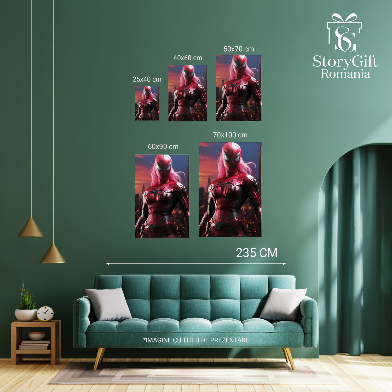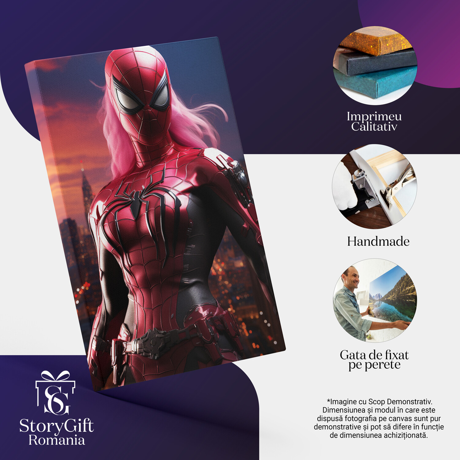 Tablou Canvas: Portret fata eroina in costum stil spider man deasupra orasului Pictura Digitala - Tablou Canvas Signature de la StoryGift Romania