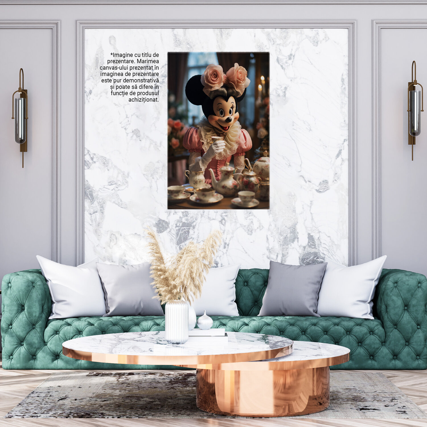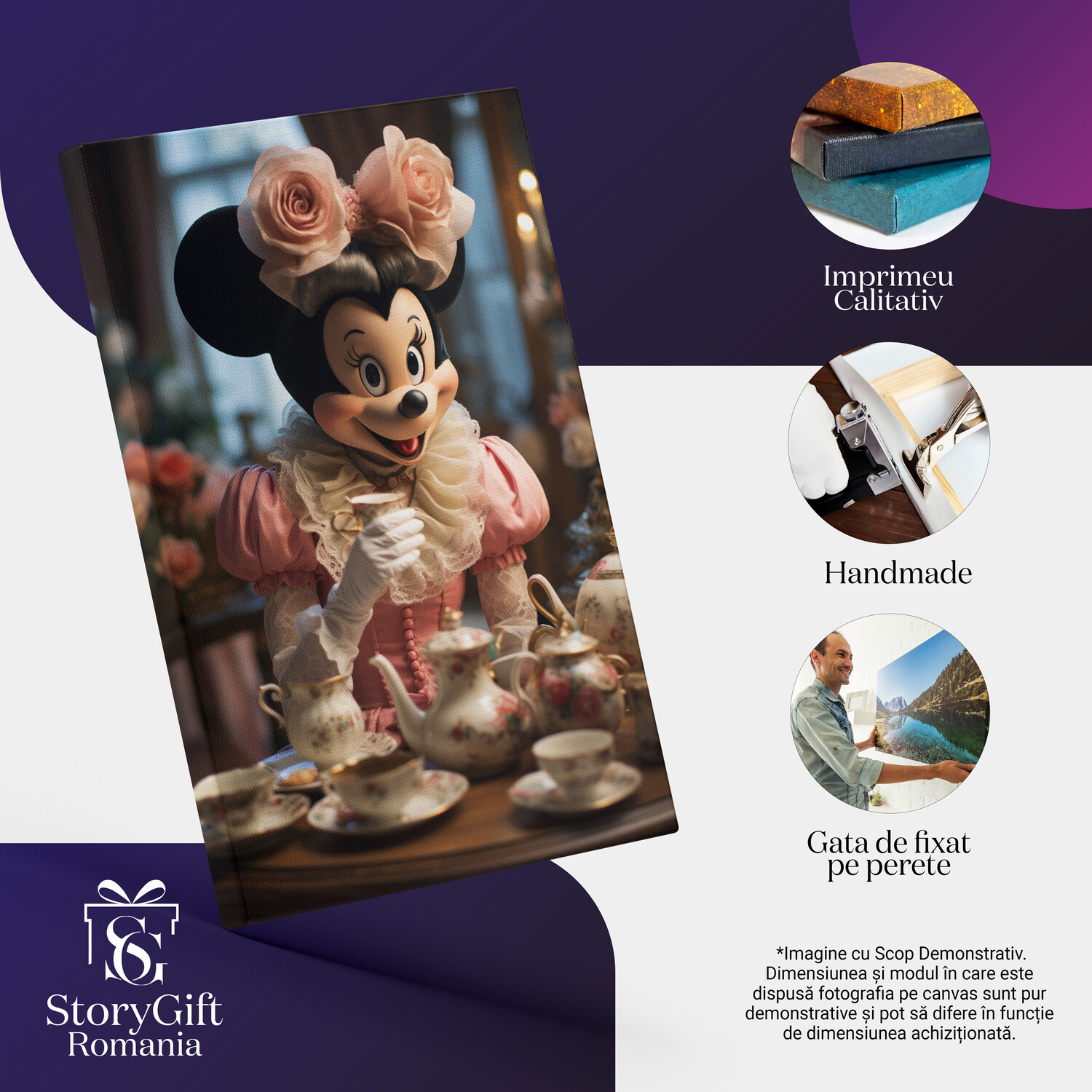 Tablou Canvas: Printesa Minnie cu Doi Trandafir Mari in Par Bea Ceai Regal cu Cesti de Lux Pictura Digitala - Tablou Canvas Signature de la StoryGift Romania