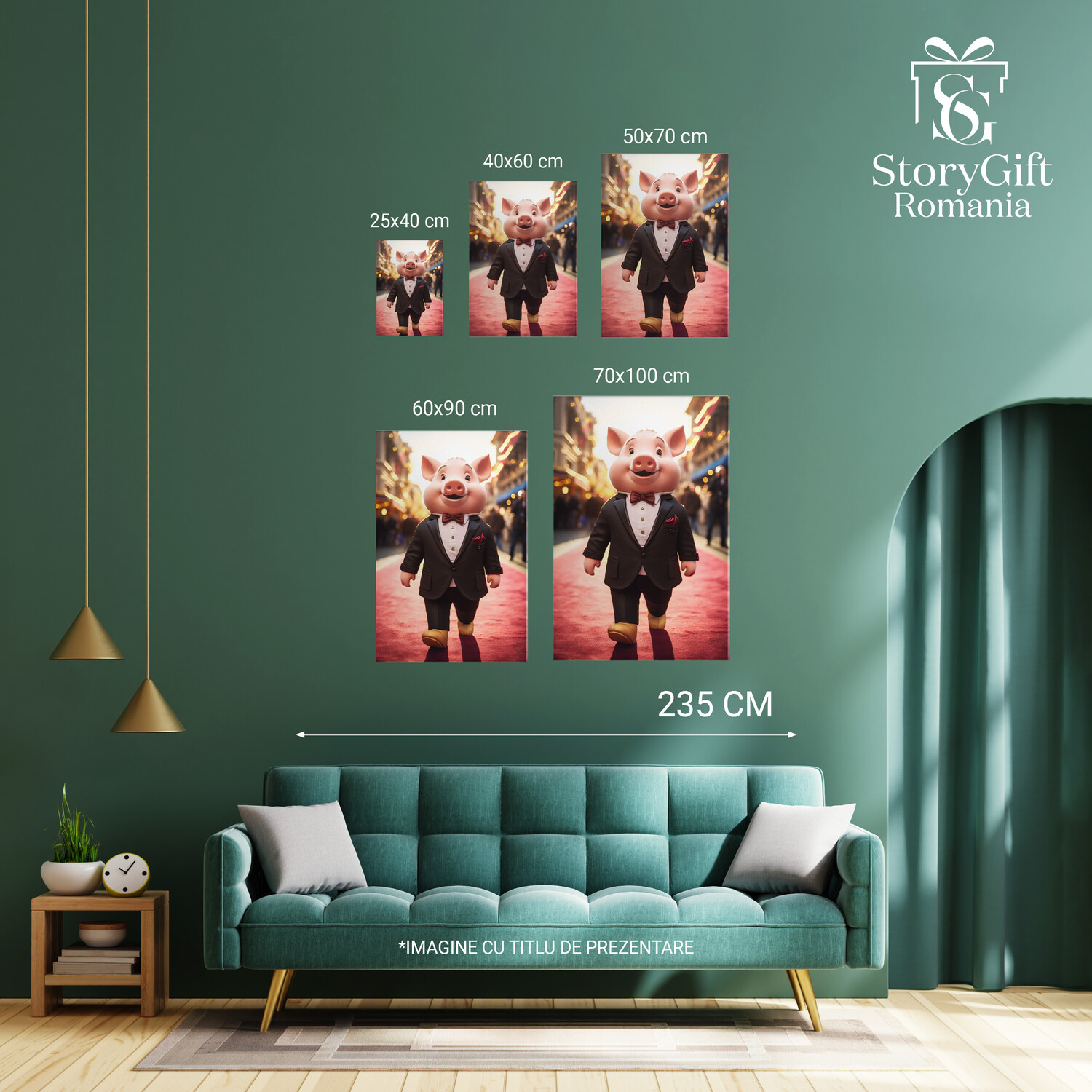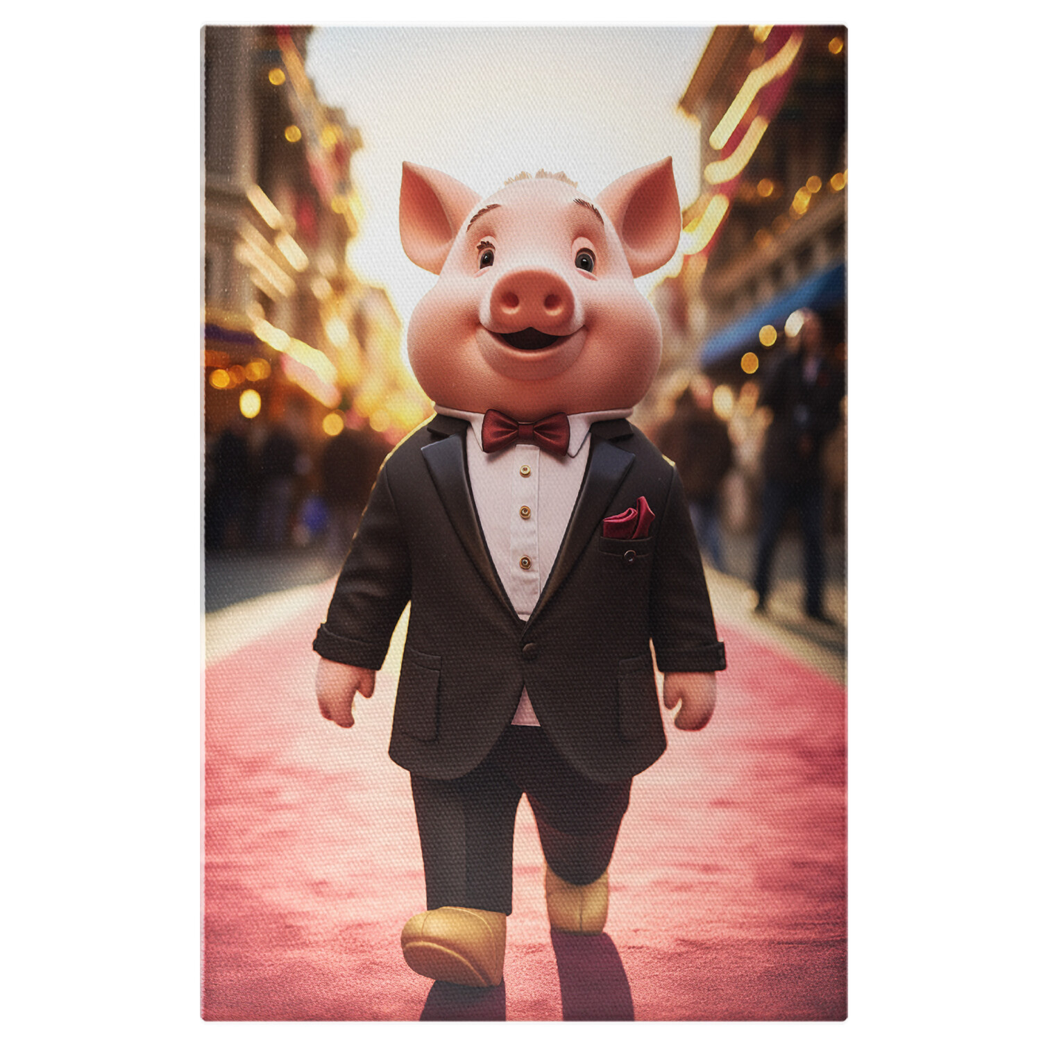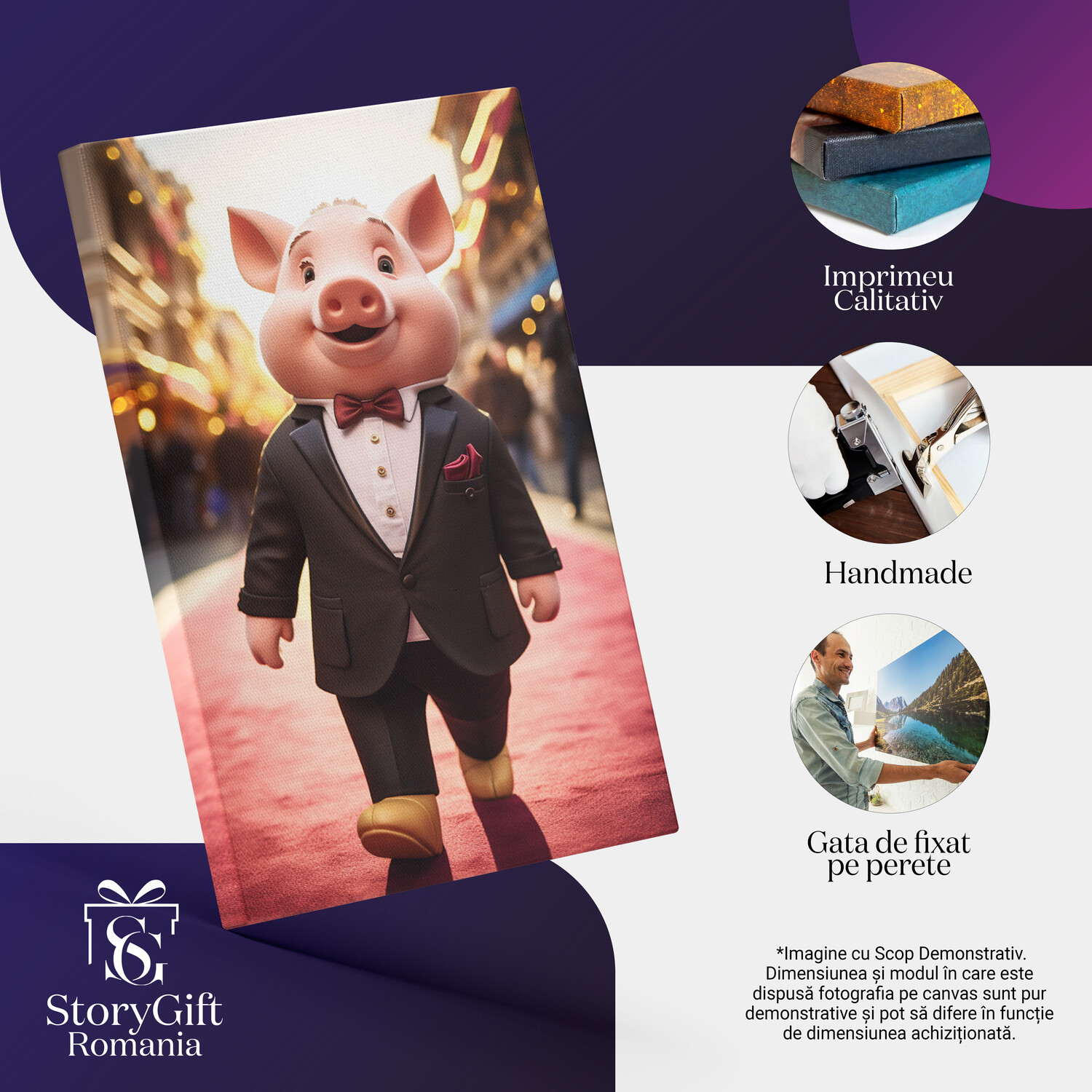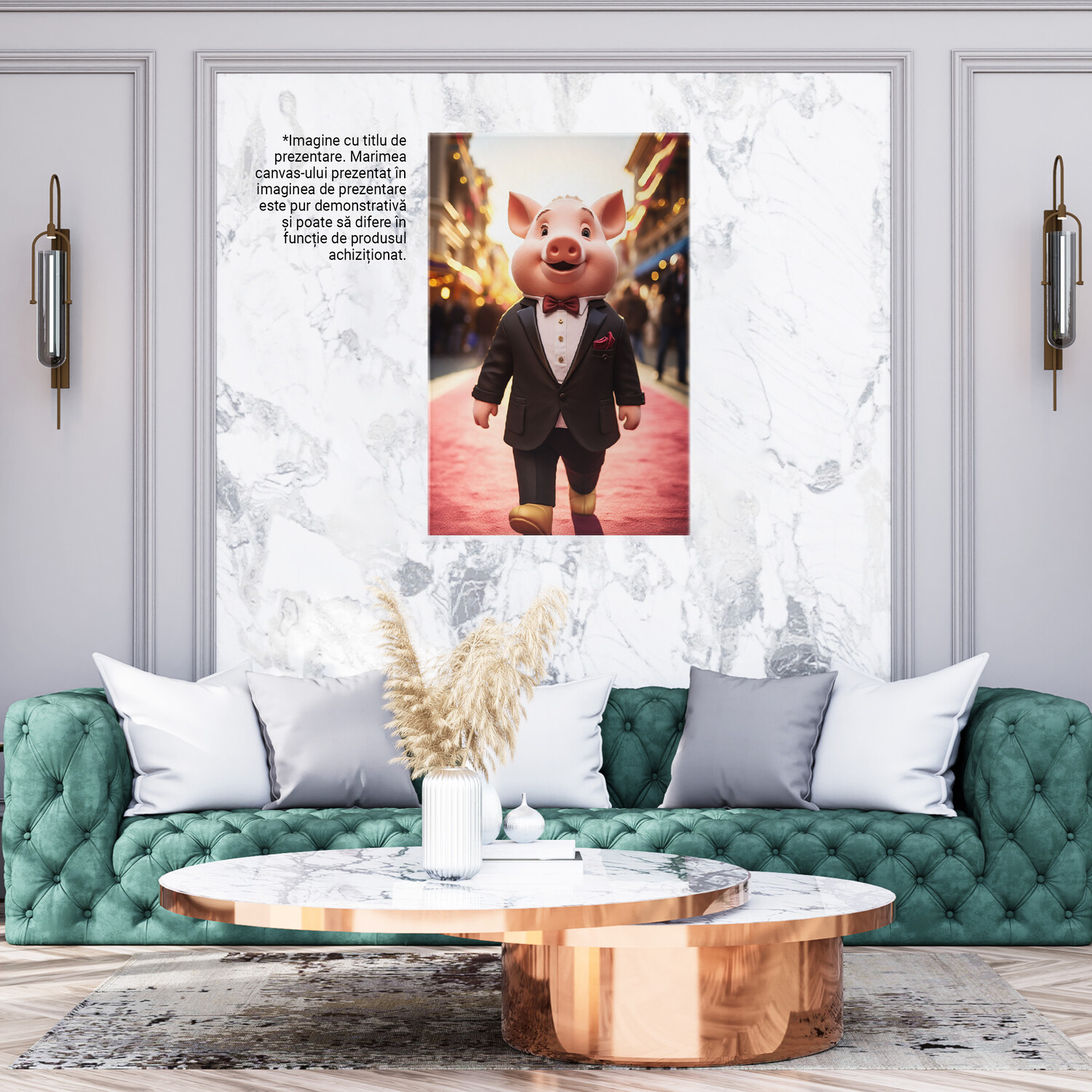 Tablou Canvas: Purcelus in Costum Negru pe Covor Rosu- Eleganta si Animale Pictura Digitala - Tablou Canvas Signature de la StoryGift Romania