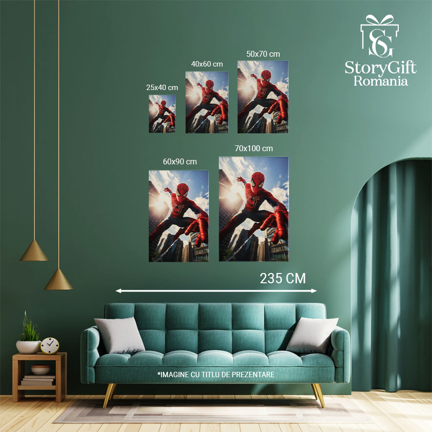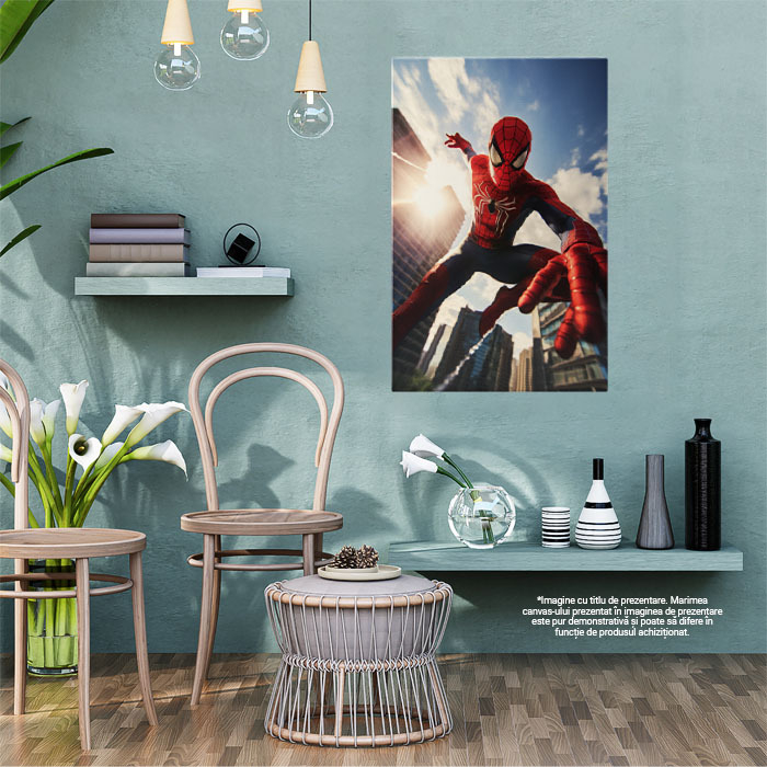 Tablou Canvas: Portret Spiderman în Săritură cu plase între Zgârie Nori Pictura Digitala 40x25CM