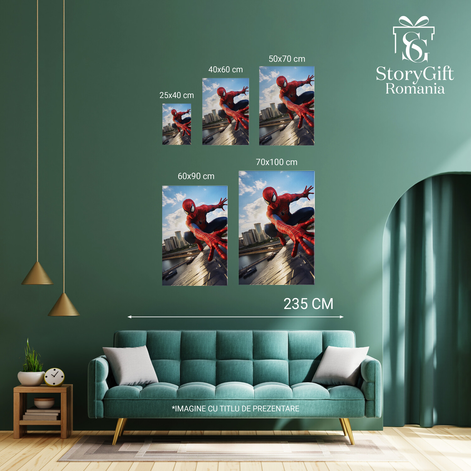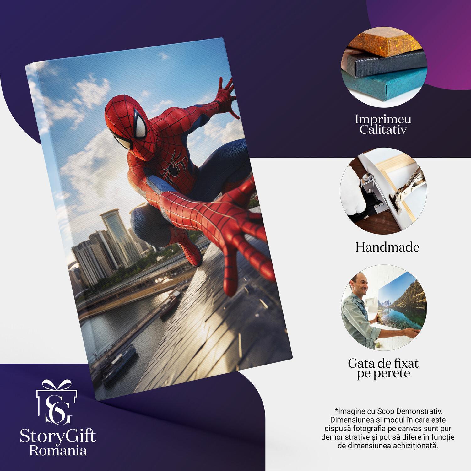 Tablou Canvas: Spiderman se Catara pe Cladiri si Orasul cu Zgarie Nori in Fundal Pictura Digitala - Tablou Canvas Signature de la StoryGift Romania