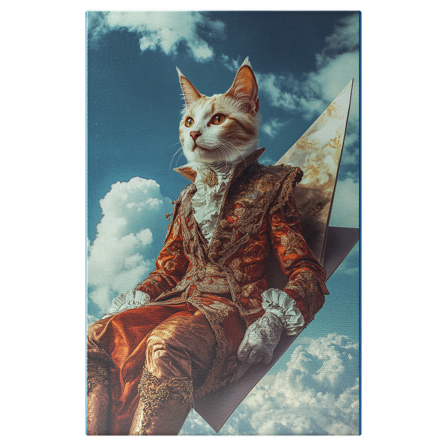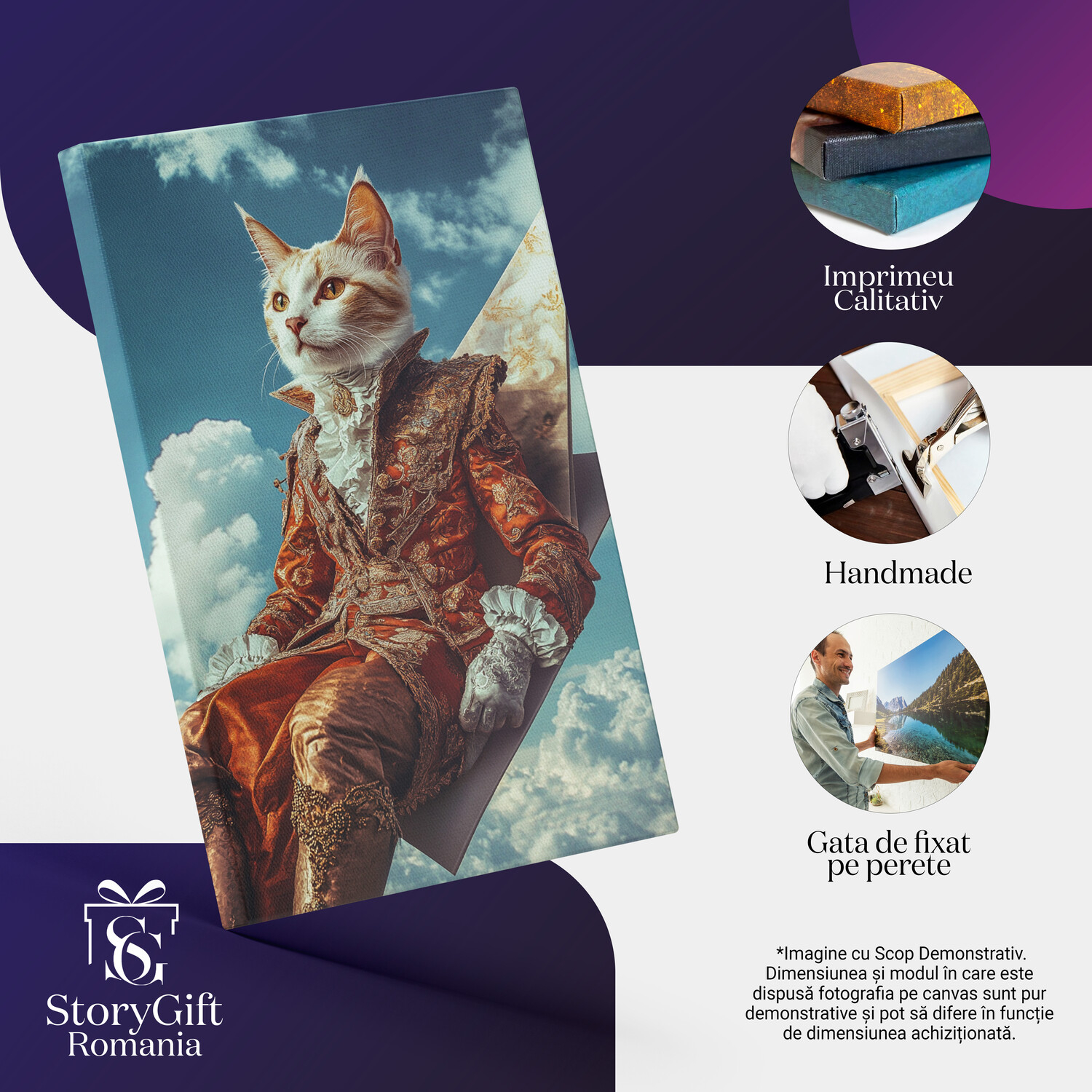 Tablou Canvas Personalizat Cavaler Cu Tinuta Regala Detalii Aurii Masive, In Cer Deasupra Norilor, Guler Inalt Alb Stil Ruff 40x25CM
