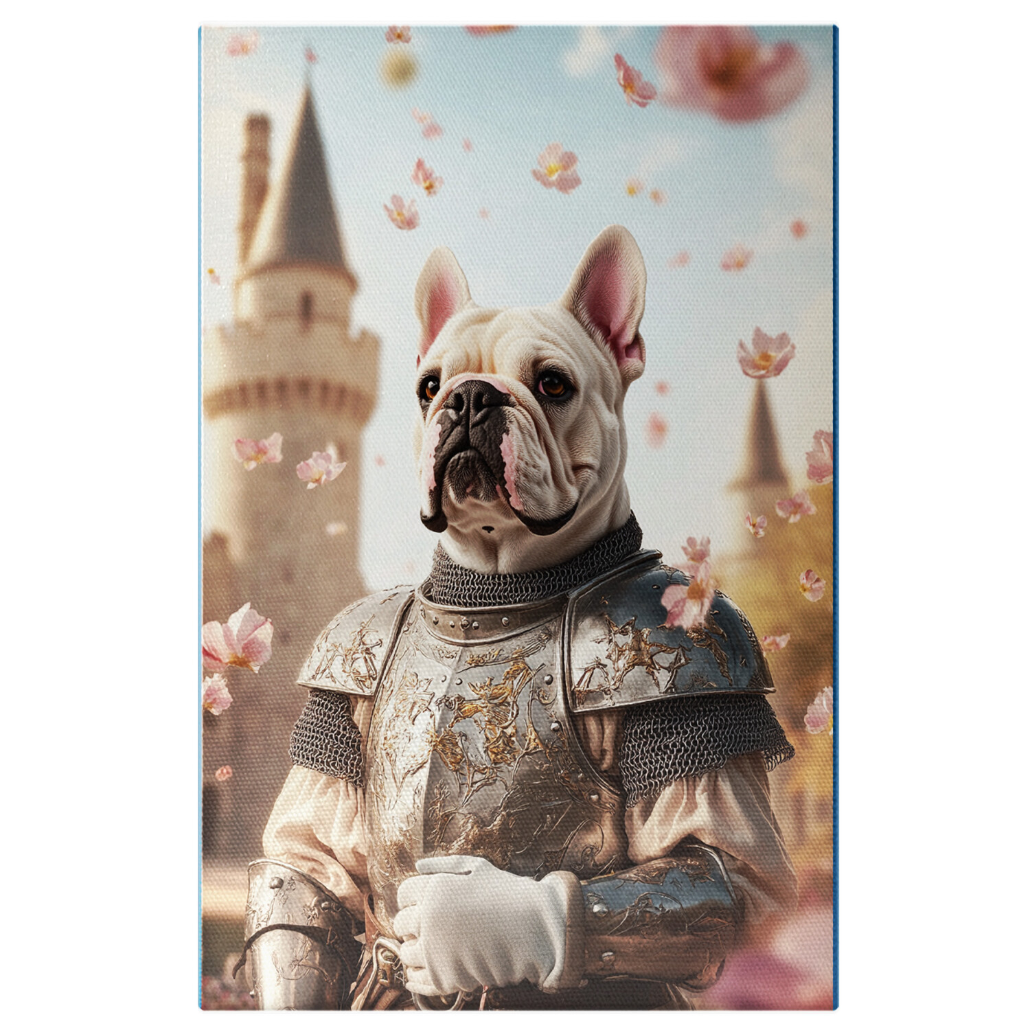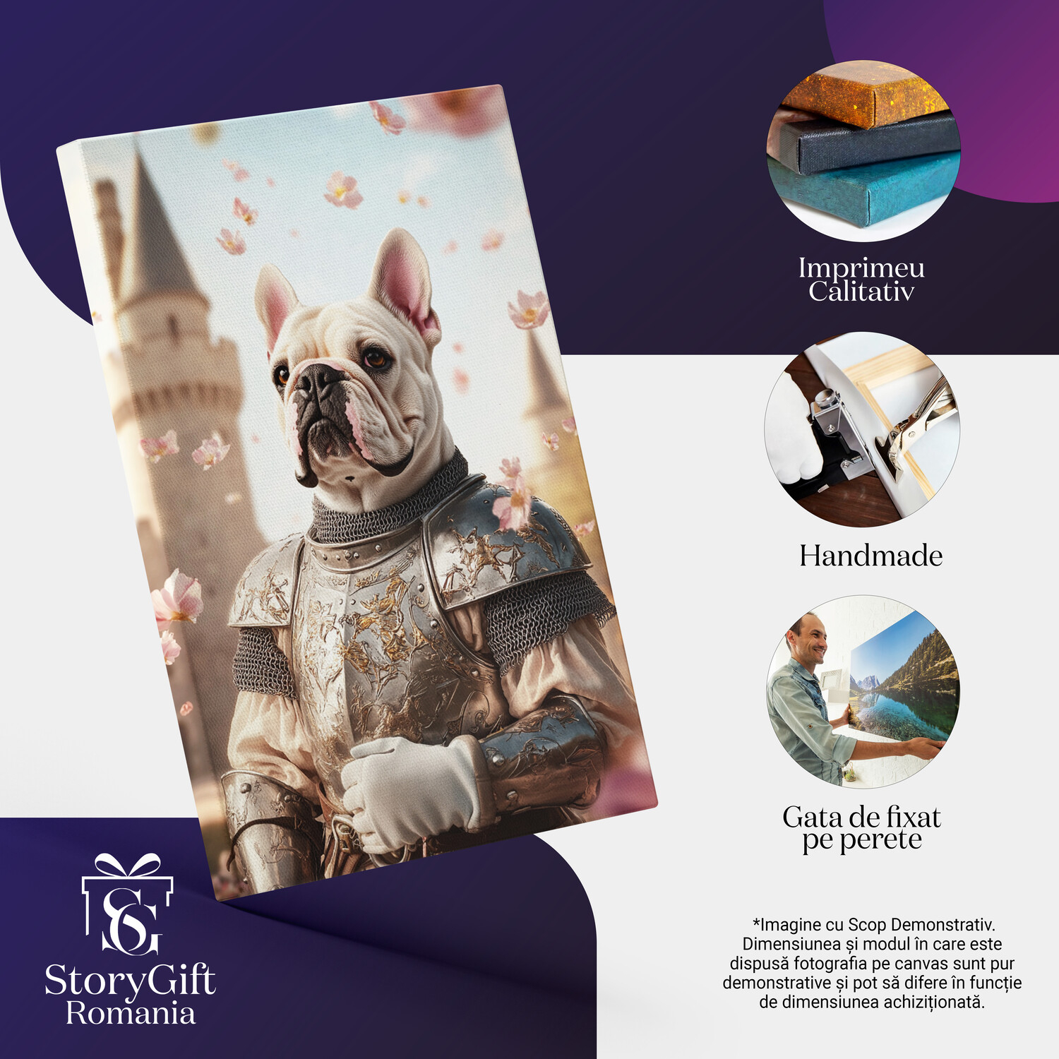 Tablou Canvas Personalizat Cavaler regal in fata castelului, armura cu detalii aurii, ahaina roz, flori roz in aer, manusi albe, siguranta 120x80CM