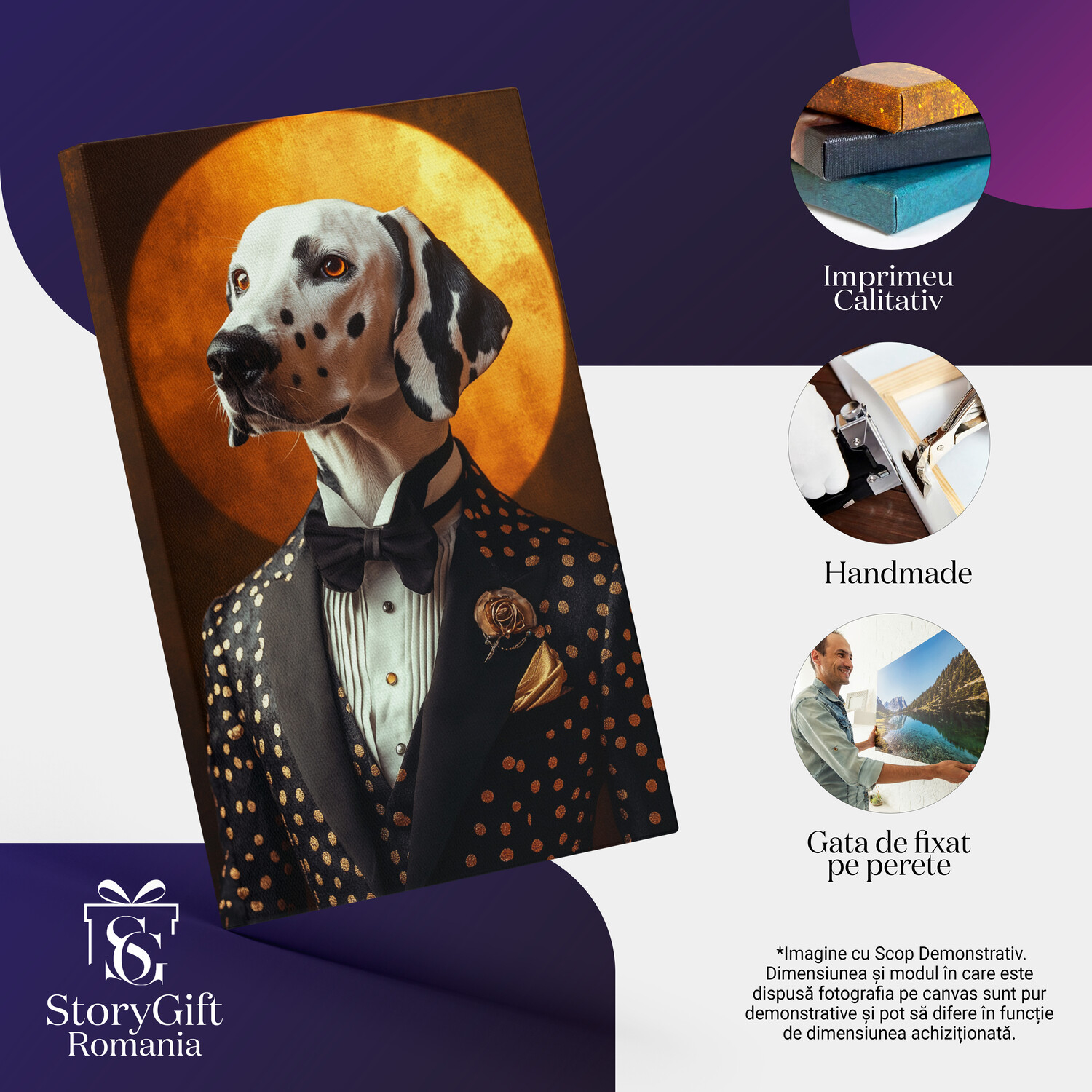 Tablou Canvas Personalizat Portret cu tinuta eleganta, sacou negru cu buleti aurii, floare si batista aurii, papion negru, luna plina, 70x50CM