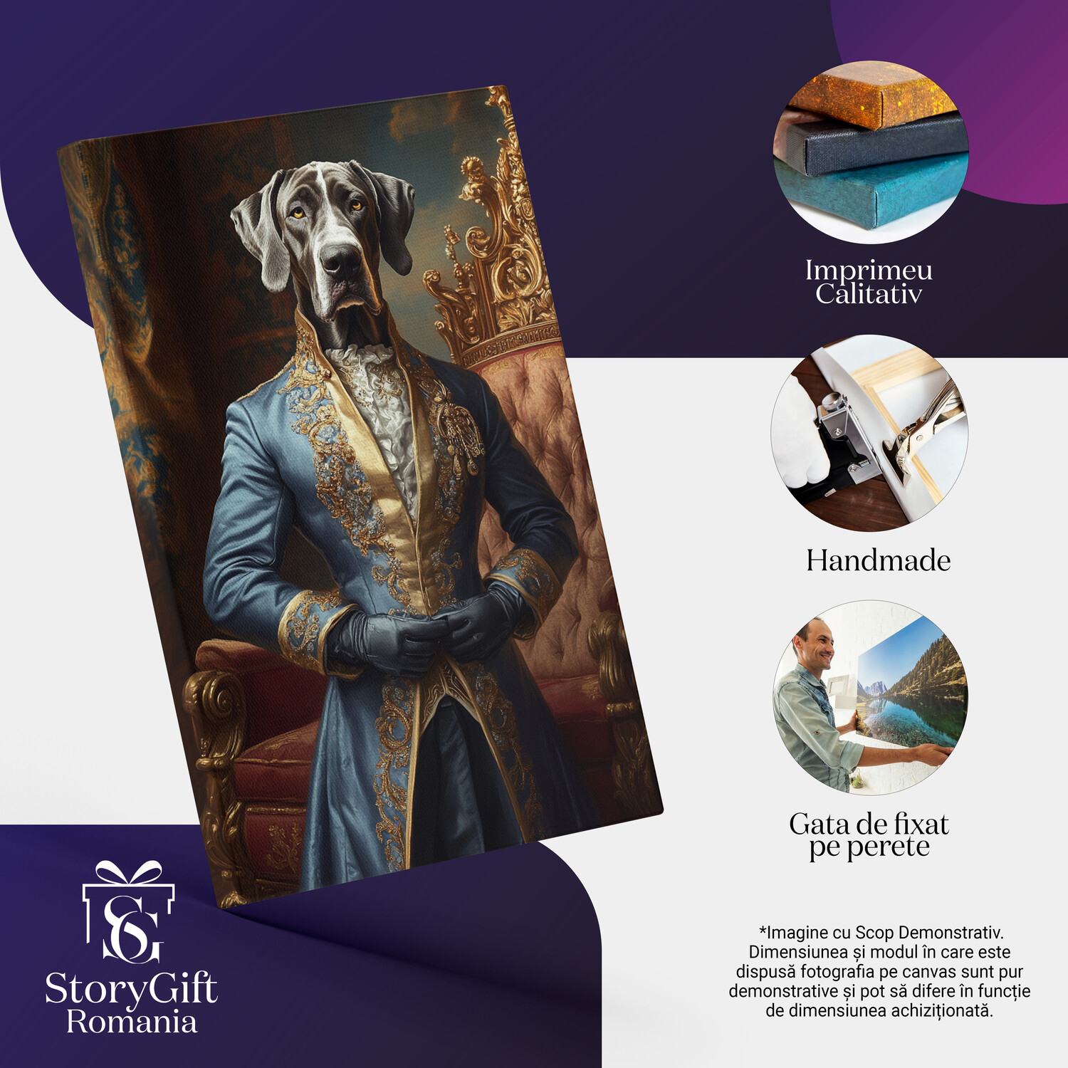 Tablou Canvas Personalizat Rege langa tron, imparat cu jacheta albastra lunga cu detalii metal aurii, pietre pretioase camasa din dantela, manusi negre 40x25CM