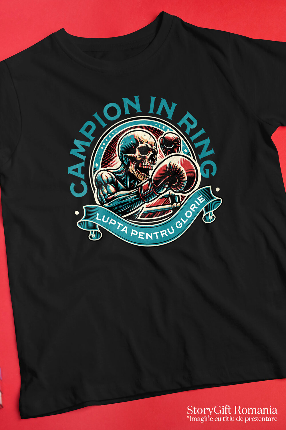 Tricou Barbati cu Schelete Uman In Meci Lupta Box Text Campion In Ring Motivational cu imprimeu pe Fata, 100% Bumbac, Negru, L