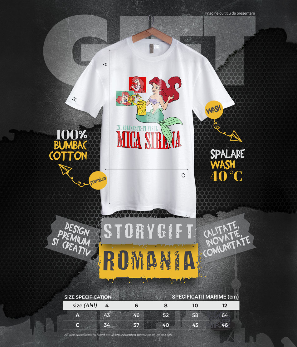 Tricou Copii cu Aventuri si Visuri cu Ariel Mica Sirena 100% Bumbac, Alb, 8 Ani
