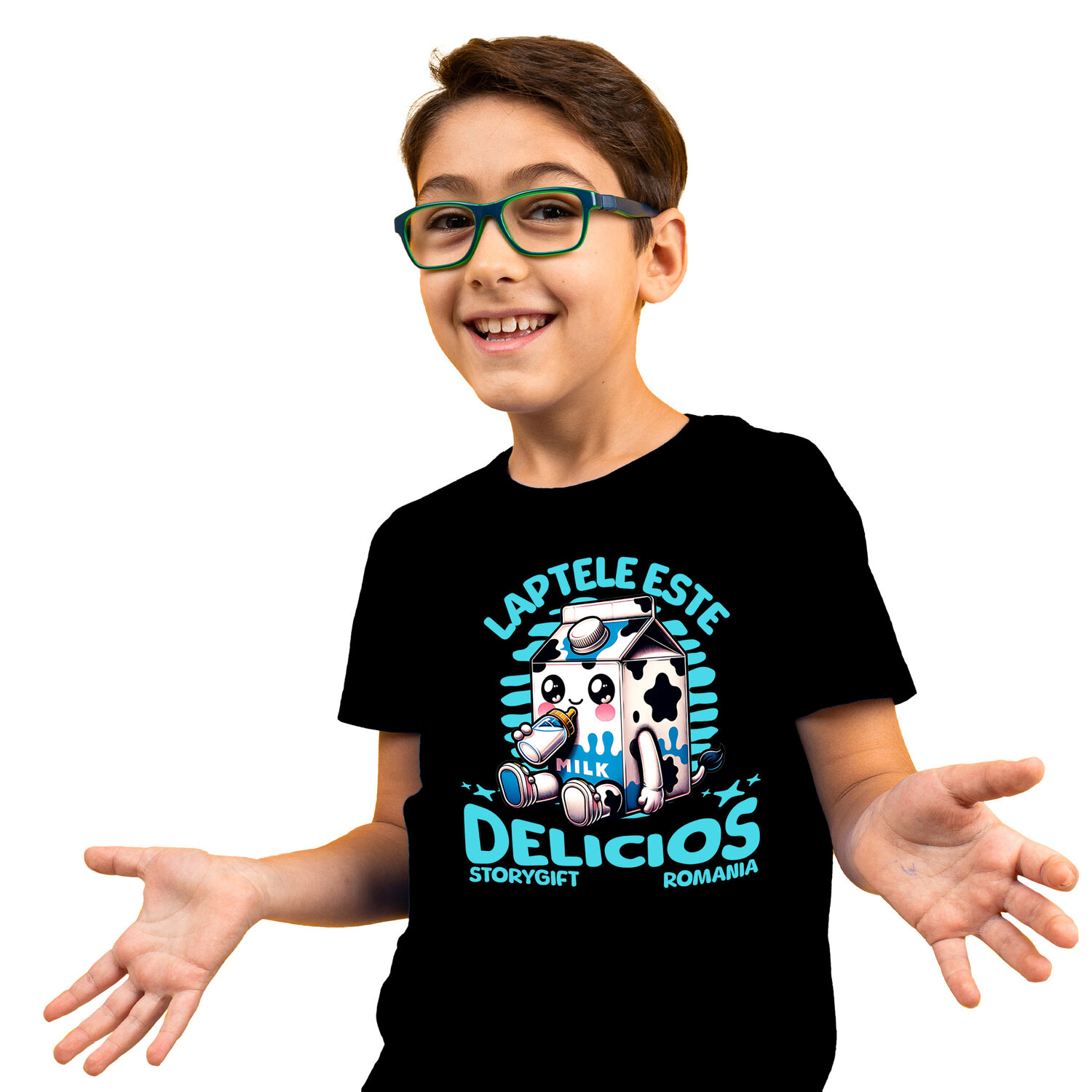 Tricou Copii cu Cutie Carton De lapte Bebe, Model De Vaca, Beberon Nou Nascut cu imprimeu pe Fata, 100% Bumbac, Negru, 8 Ani
