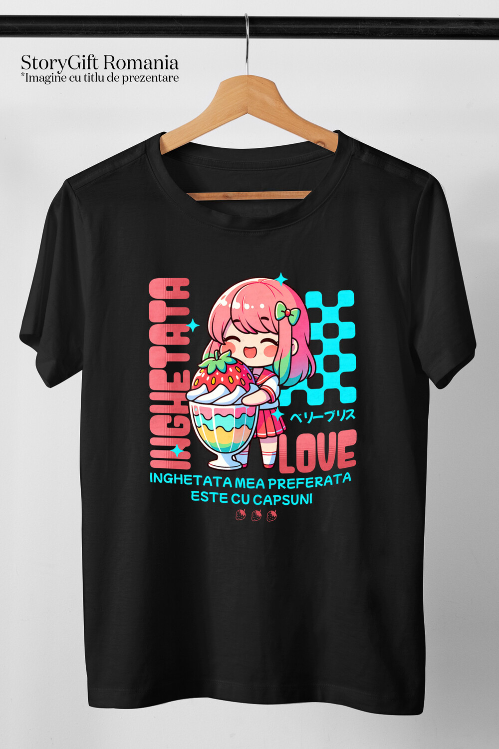 Tricou Copii cu Fata Stil Anime Cu Pahar imens De Milkshake Si Capsuna Inghetata cu imprimeu pe Fata, 100% Bumbac, Negru, 12 Ani