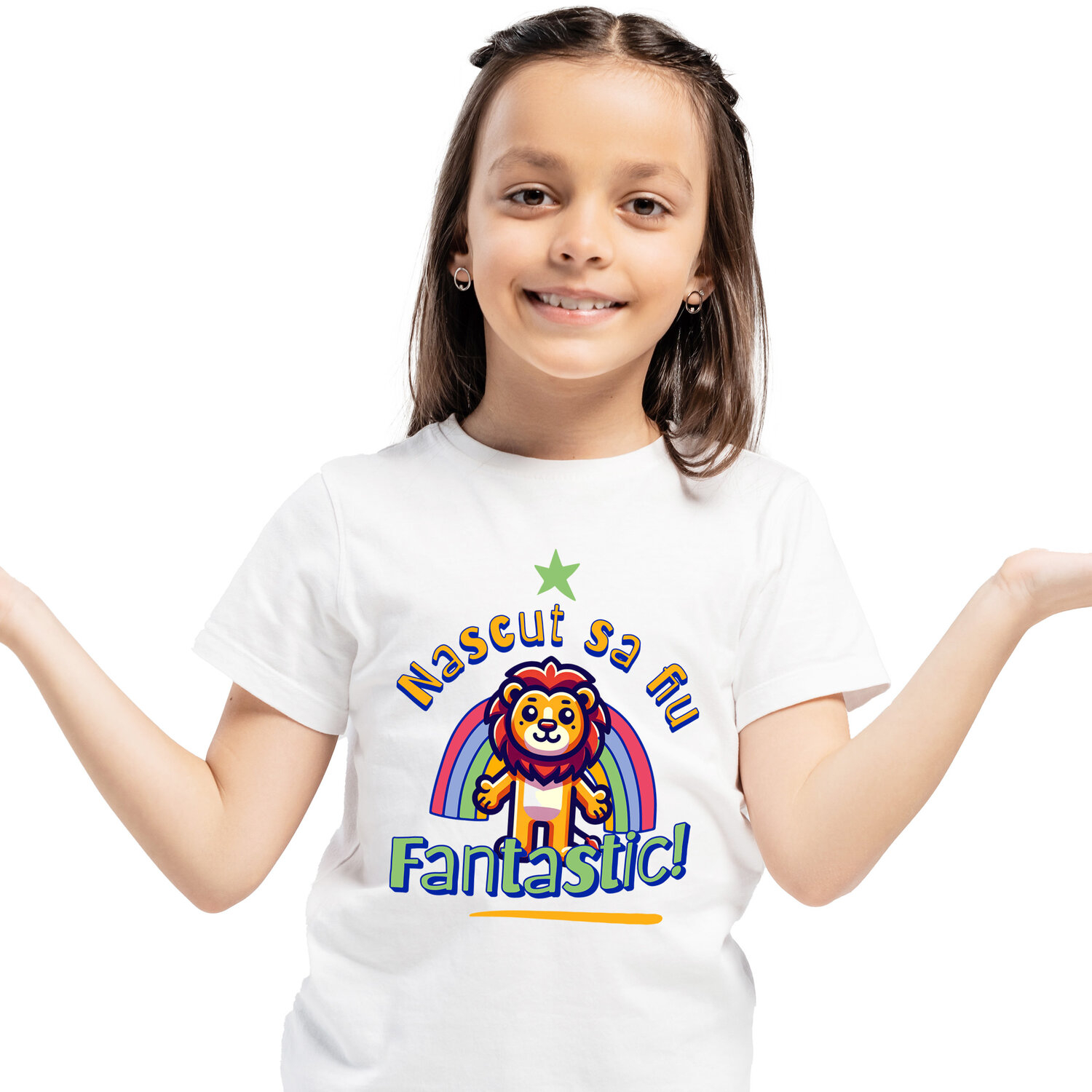 Tricou Copii cu Leu cu Coama Curcubeu Fericit, Copii, Jungla, Animal Feroce cu imprimeu pe Fata, 100% Bumbac, Alb, 8 Ani