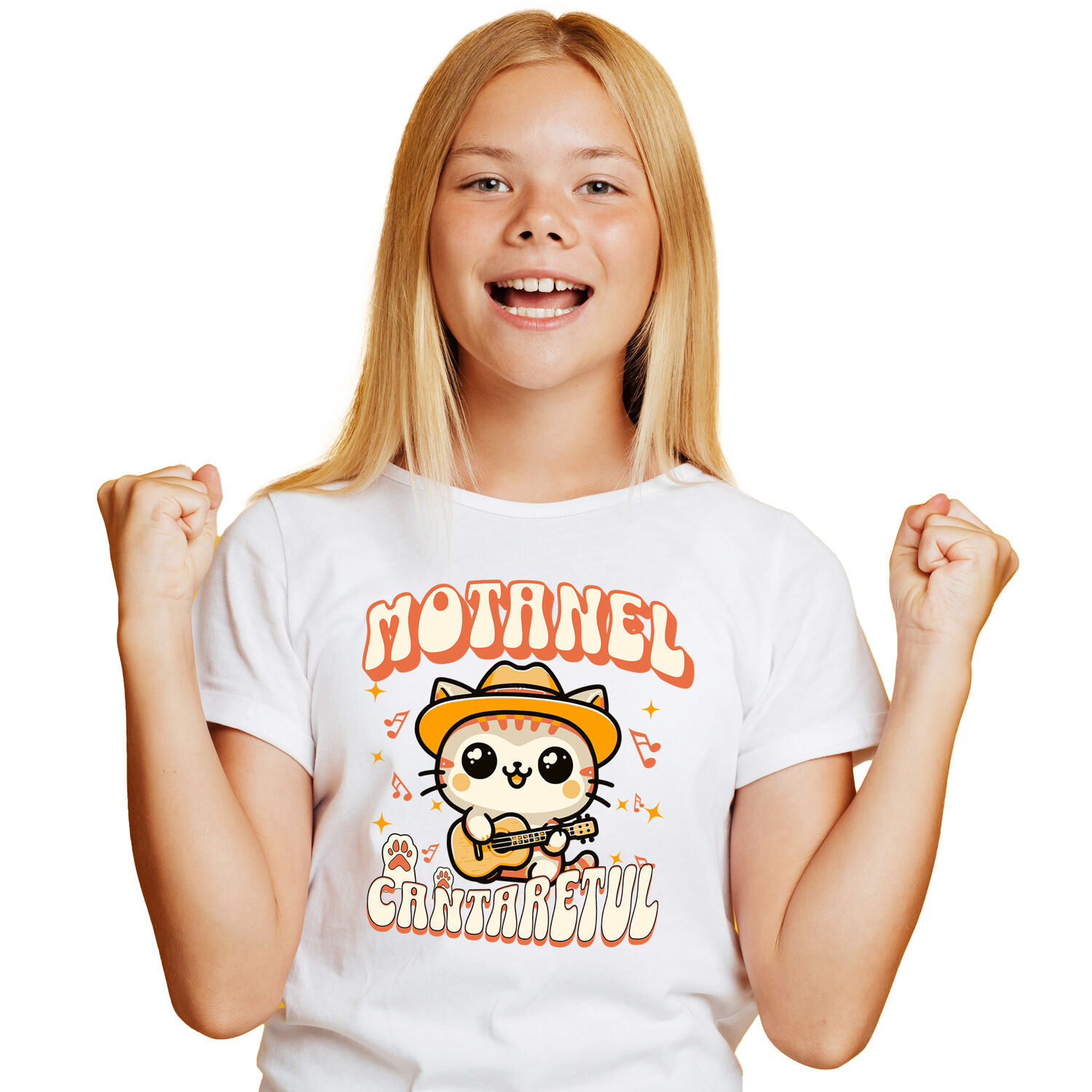 Tricou Copii cu Motan Cu Palarie Mexicana Si Chitara Animal Blanos, Iubitorii De Pisici cu imprimeu pe Fata, 100% Bumbac, Alb, 8 Ani