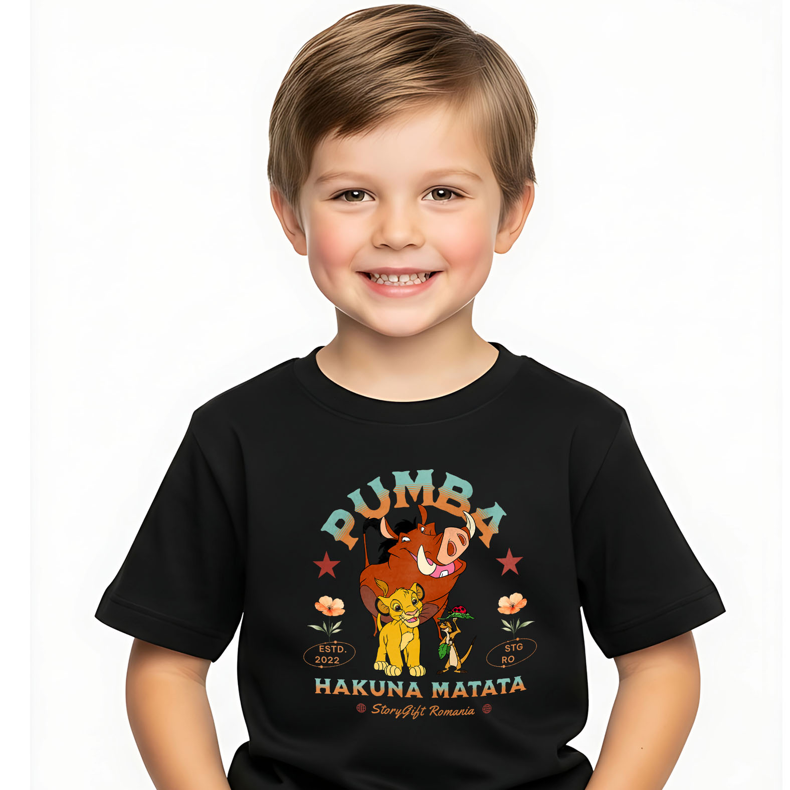 Tricou Copii cu Pumba si Prietenii – Ziua Magica printre Flori 100% Bumbac, Negru, 12 Ani