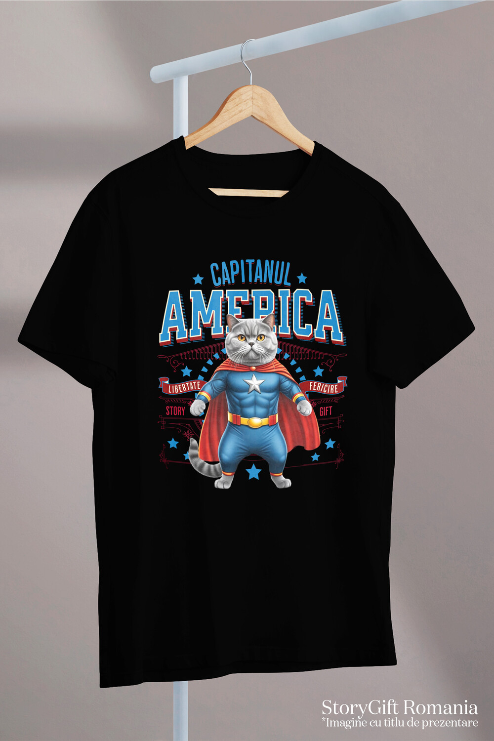 Tricou Copii cu Siamez / Siamese Pisica In Costum de Capitan America cu Pelerina, Erou Nocturn, Desene animate, Copii, Iubitorii de Animale cu imprimeu pe Fata, 100% Bumbac, Negru, 8 Ani
