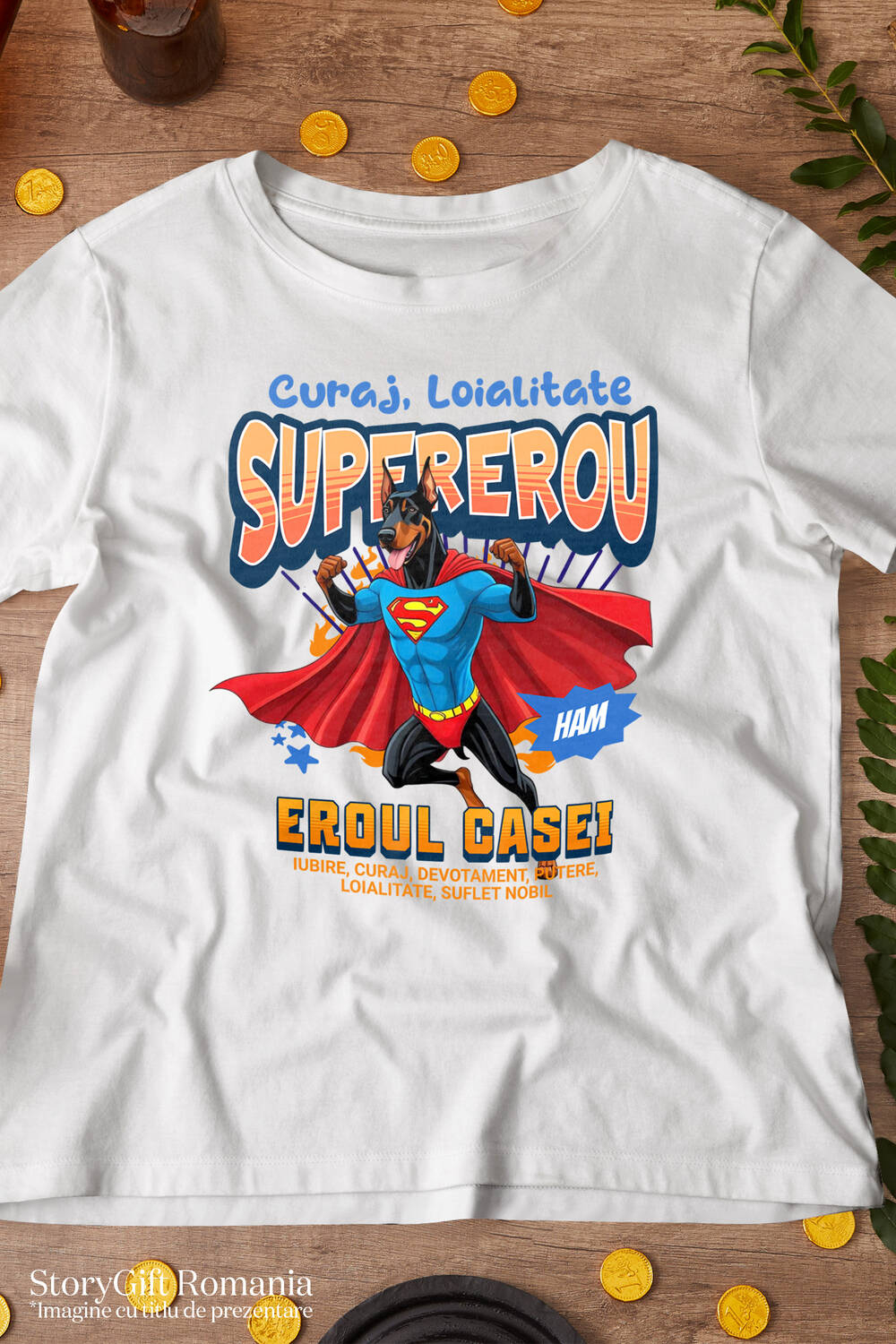 Tricou Femei cu Doberman Pinscher Caine In Costum de SuperMan cu Pelerina, Erou Nocturn, Desene animate, Copii, Iubitorii de Animale cu imprimeu pe Fata, 100% Bumbac, Alb, S