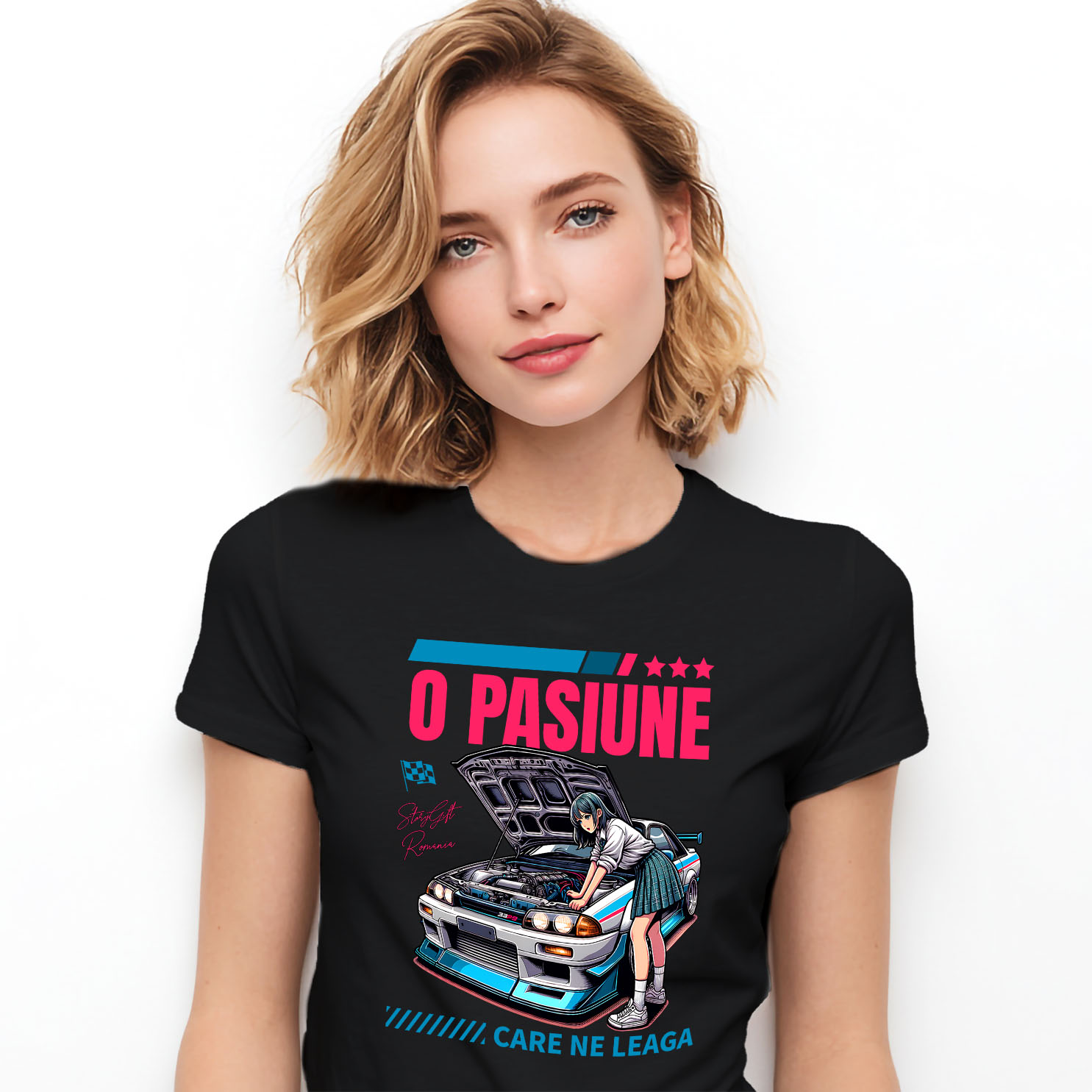 Tricou Femei cu Fata Stil Anime Tinuta Moderna Masina De Curse Colorata Motor Puternic cu imprimeu pe Fata, 100% Bumbac, Negru, L