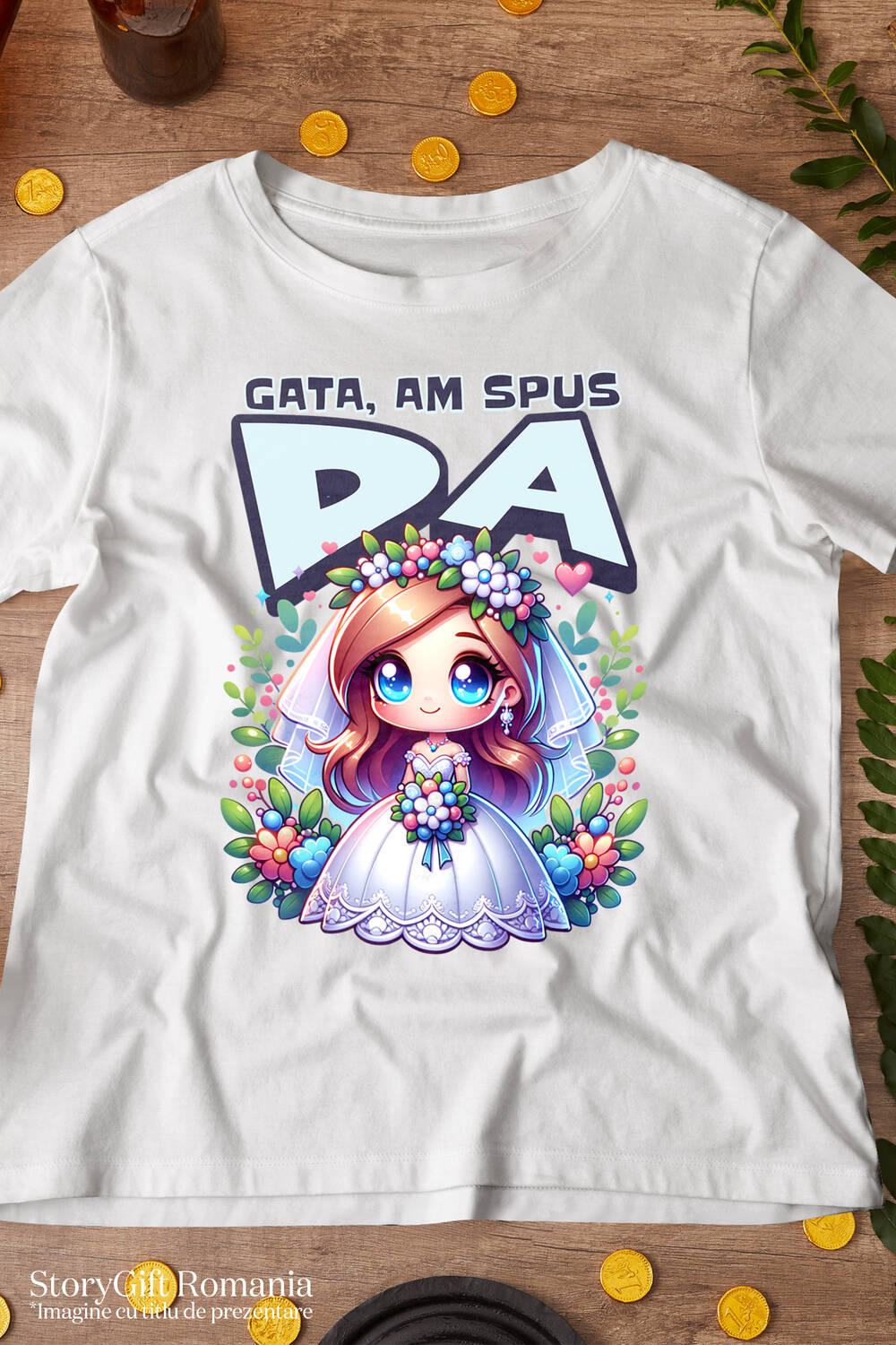 Tricou Femei cu Femeie In Rochie De Mireasa,Casatorie, Petrecere, Familie cu imprimeu pe Fata, 100% Bumbac, Alb, M