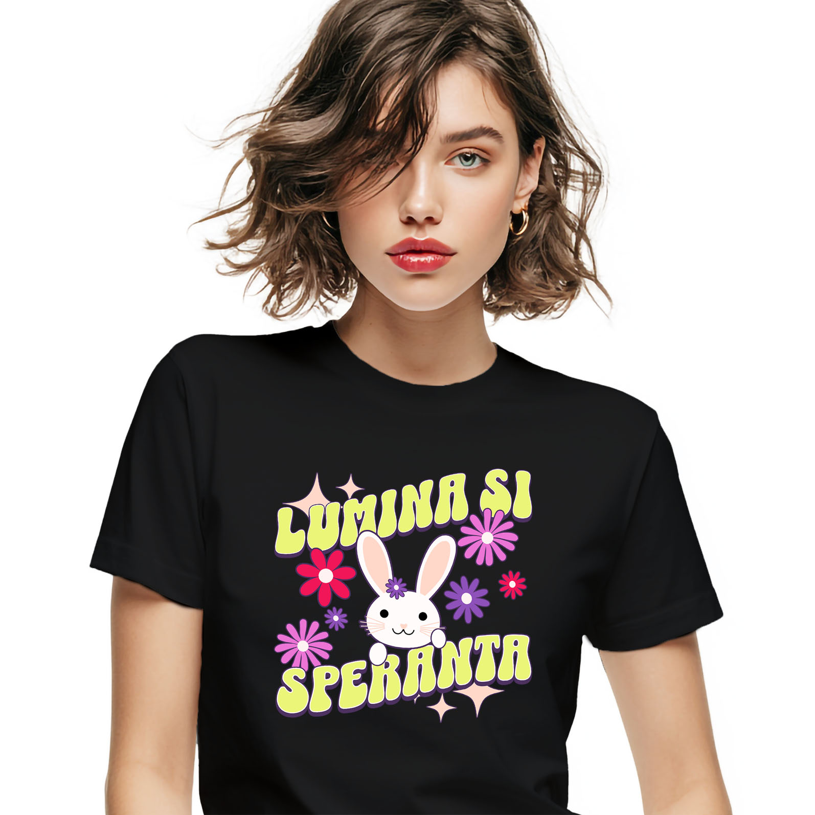 Tricou Femei cu Iepure Cu Floare Si Urechi Lungi Sarbatori Pascale Copii, Oua Colorate cu imprimeu pe Fata, 100% Bumbac, Negru, XL