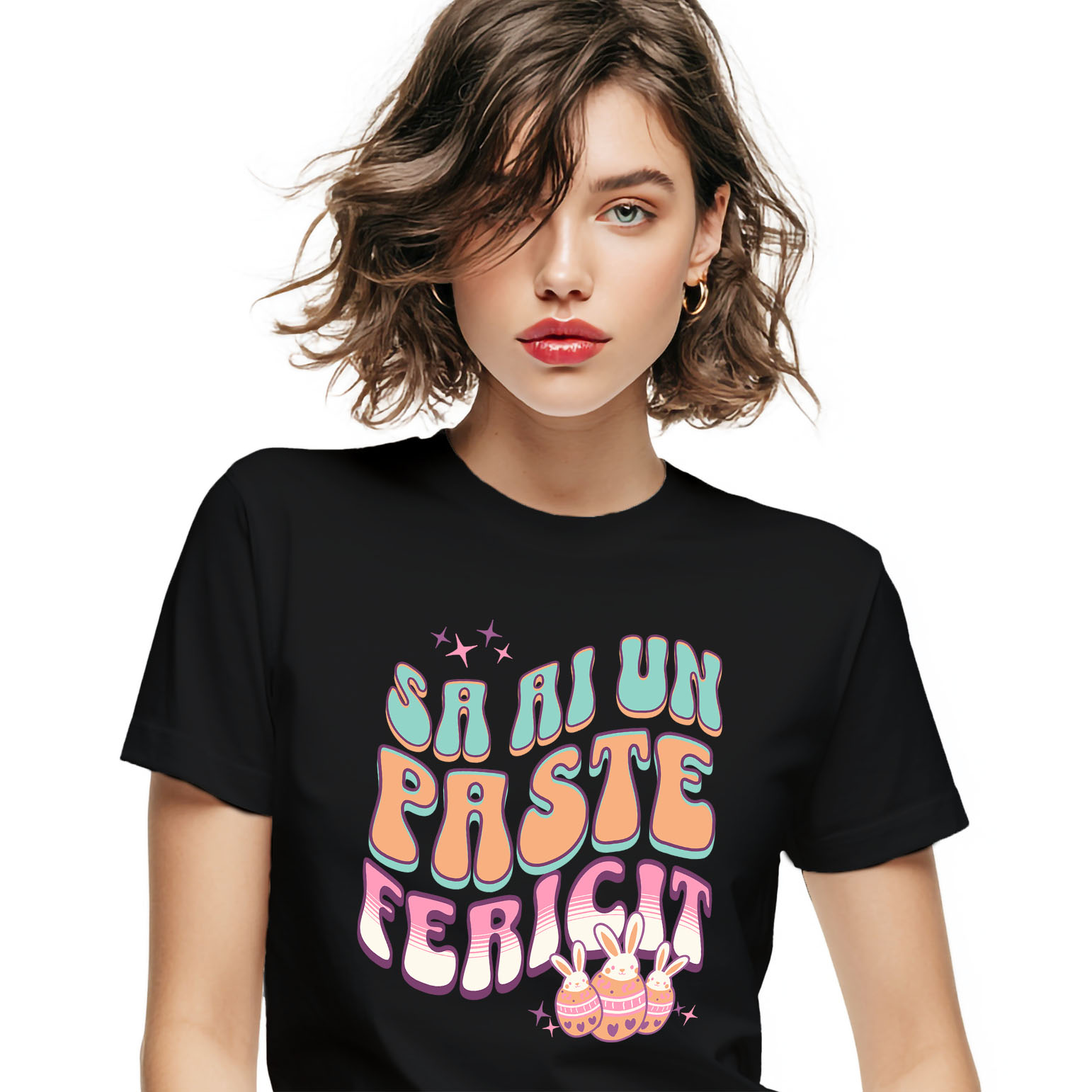 Tricou Femei cu Oua Colorate Cu Iepuri Albi, design Multicolor, Paste, Sarbatori Pascale, Copii cu imprimeu pe Fata, 100% Bumbac, Negru, L