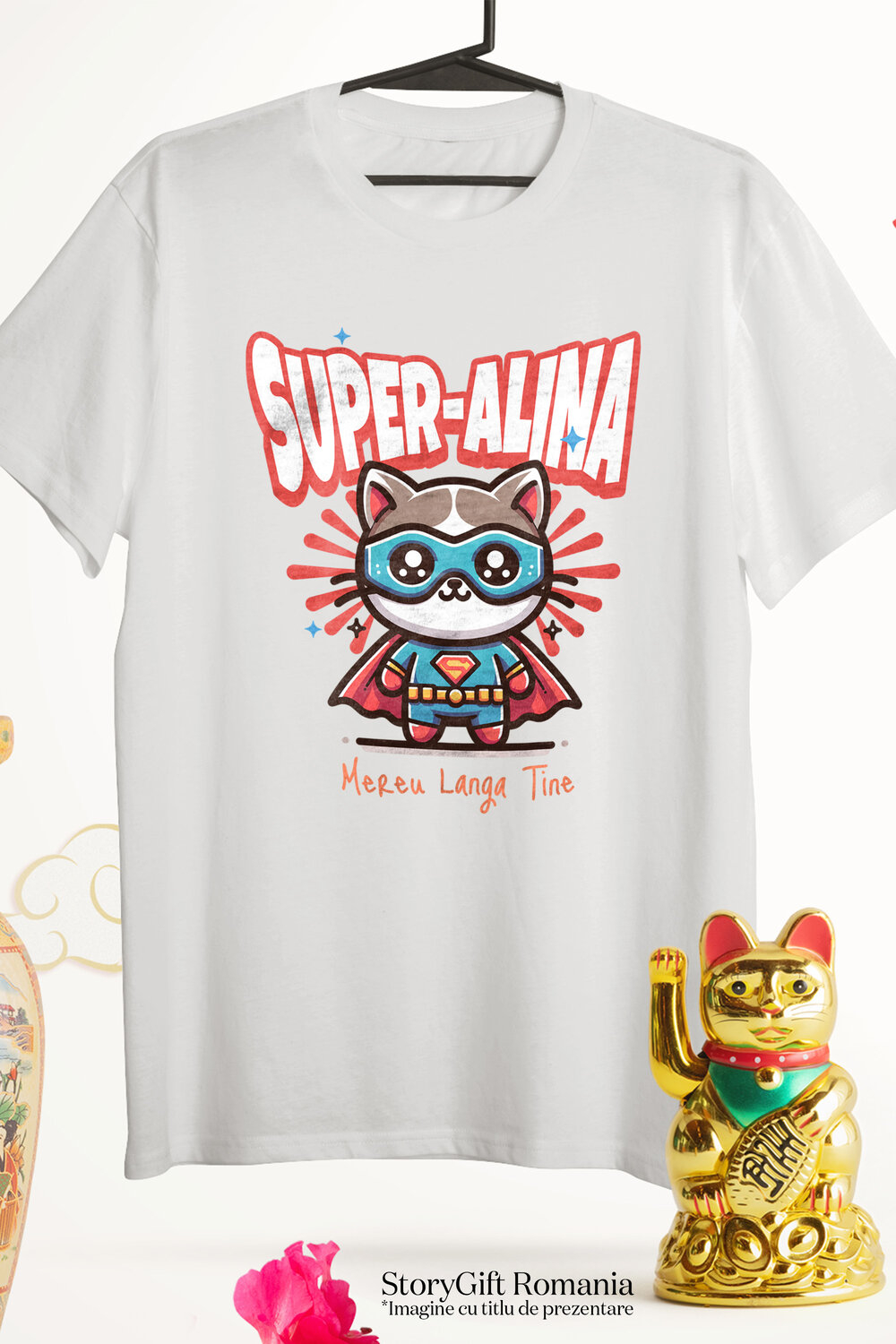 Tricou Femei cu Pisica Animata Cu Masca Si Costum De Super erou Desen Animate cu imprimeu pe Fata, 100% Bumbac, Alb, S