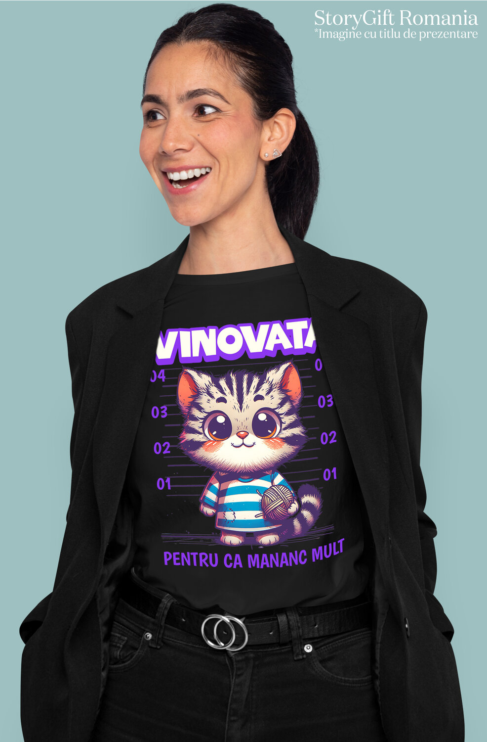 Tricou Femei cu Pisica In Dungi Cu Ghem De Lana Arestata, Iubitorii De Motani, Animal Blanos cu imprimeu pe Fata, 100% Bumbac, Negru, XL