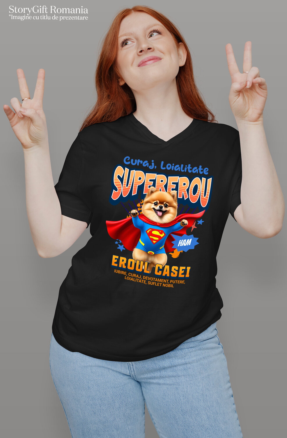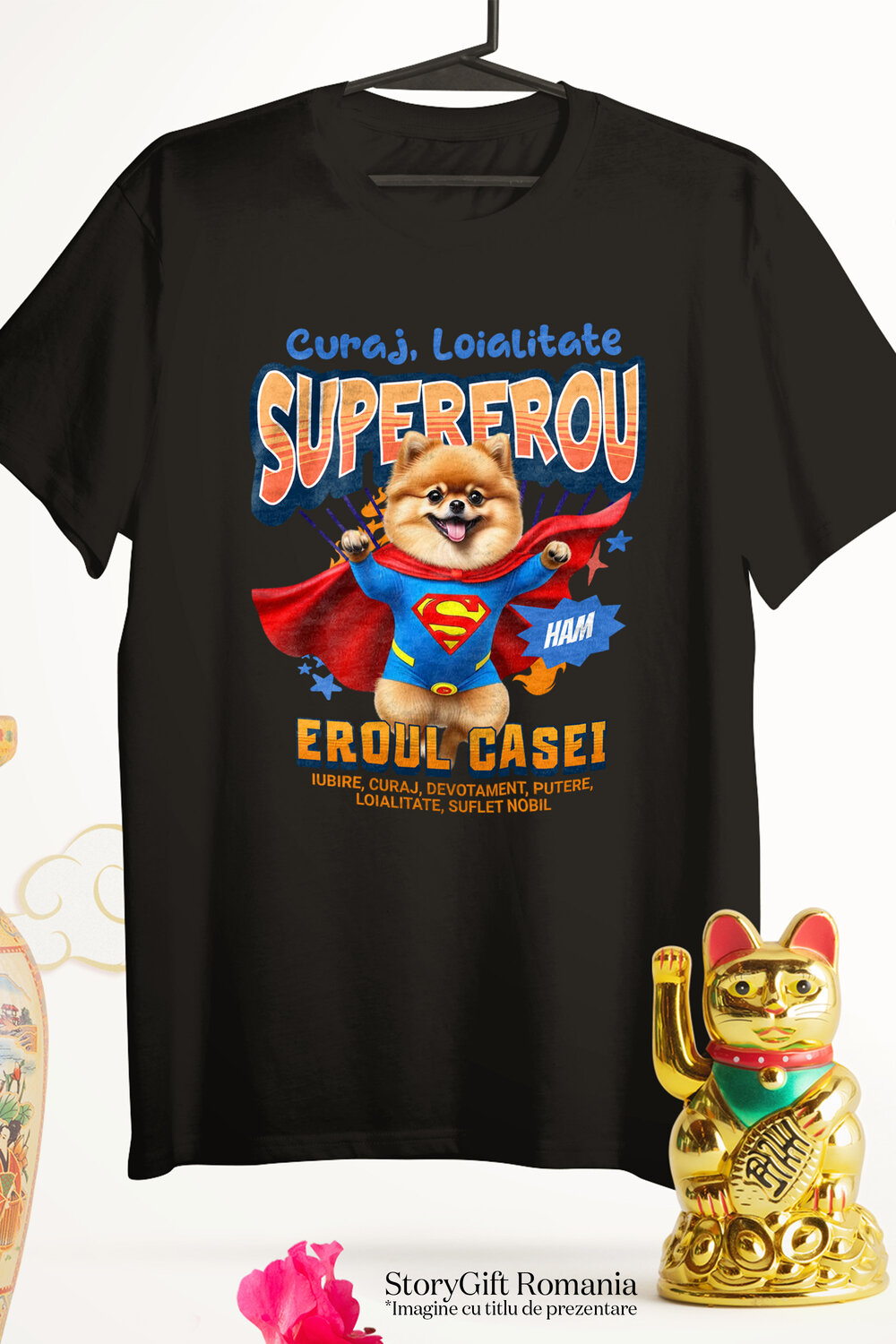 Tricou Femei cu pomeranian Pisica In Costum de SuperMan cu Pelerina, Erou Nocturn, Desene animate, Copii, Iubitorii de Animale cu imprimeu pe Fata, 100% Bumbac, Negru, L