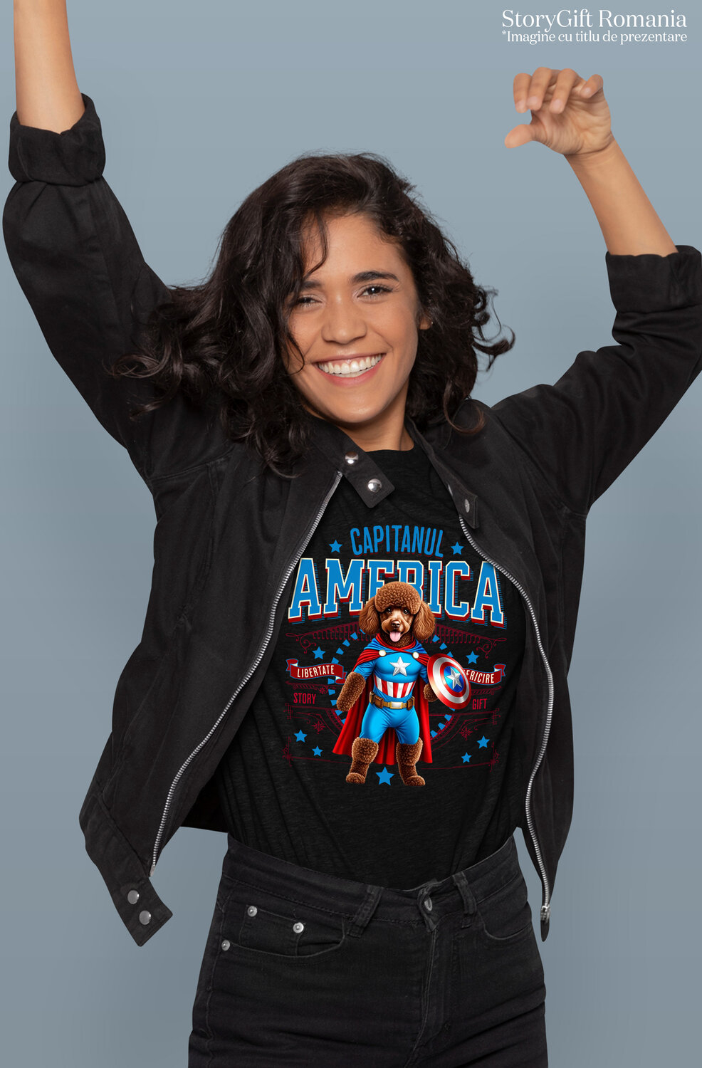 Tricou Femei cu Pudel / Poodle Caine In Costum de Capitan America cu Pelerina, Erou Nocturn, Desene animate, Copii, Iubitorii de Animale cu imprimeu pe Fata, 100% Bumbac, Negru, S