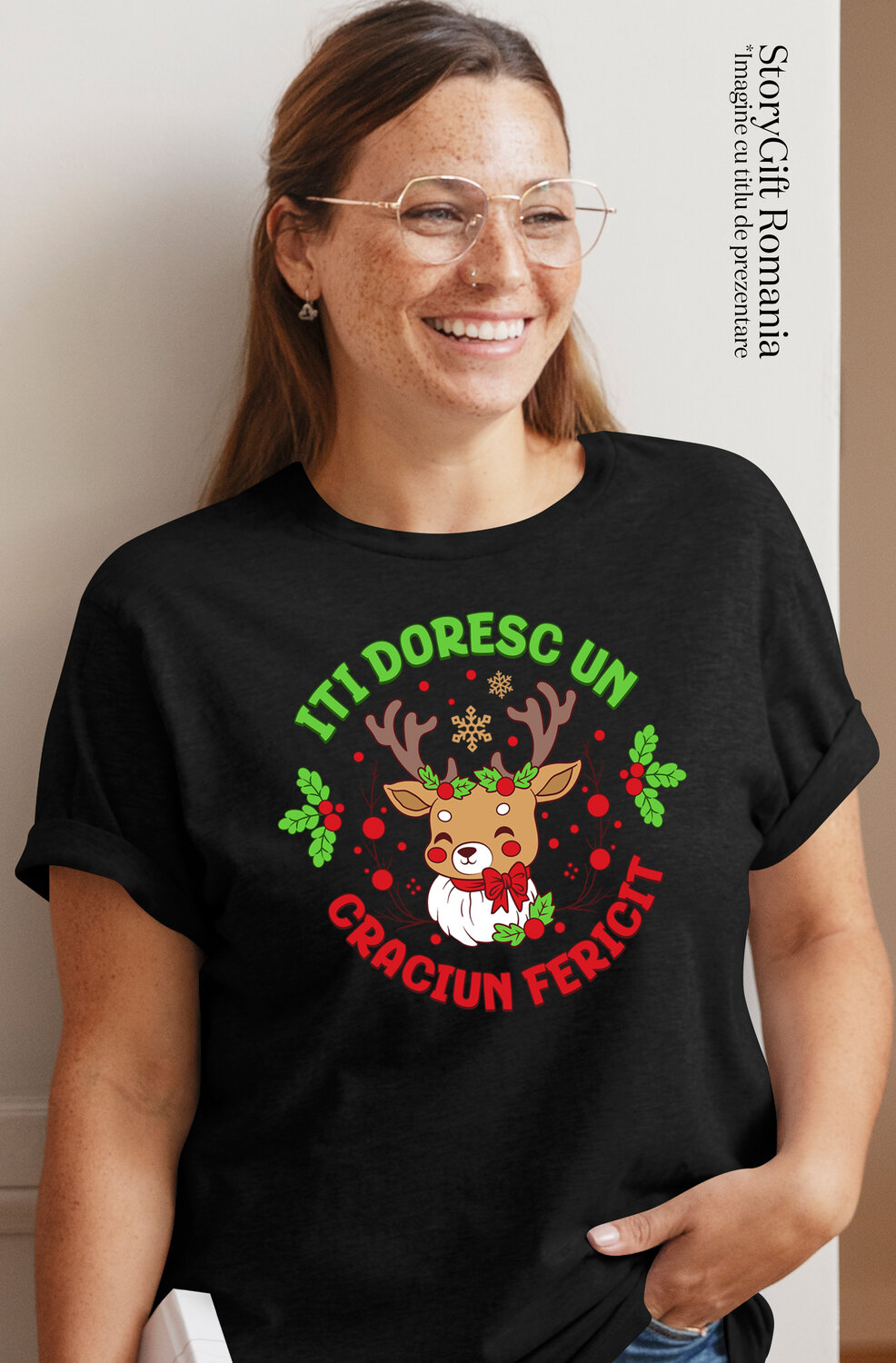 Tricou Femei cu Ren Cu Coarne Lungi Impodobite, Craciun, Globuri, Vasc, Cadouri cu imprimeu pe Fata, 100% Bumbac, Negru, XL