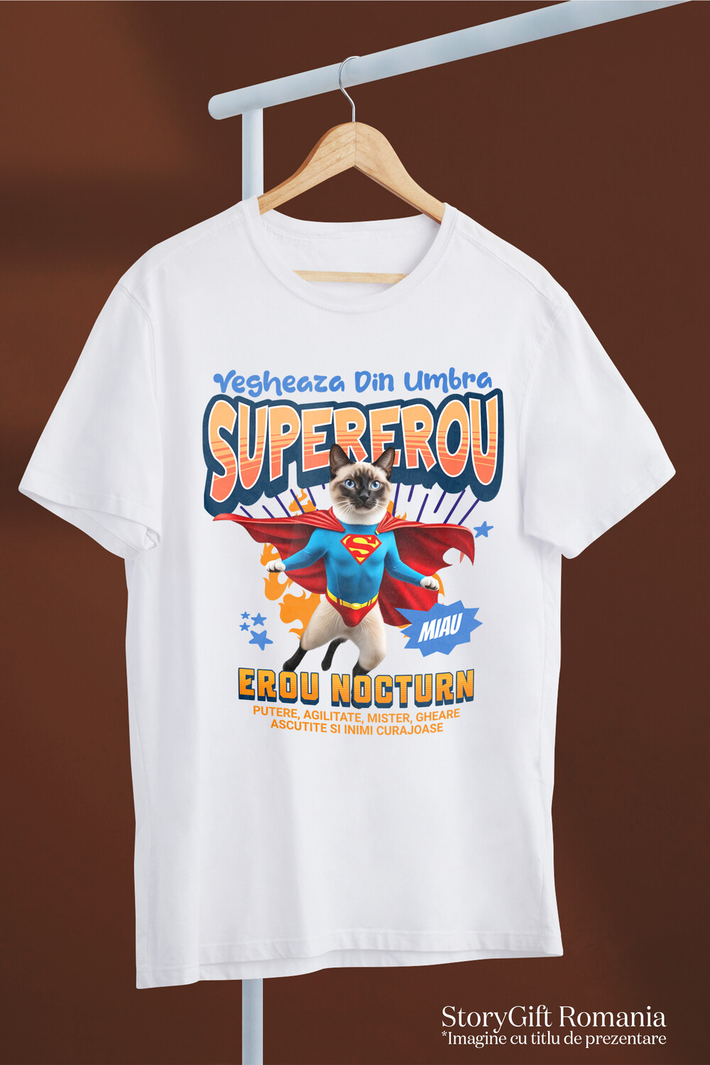 Tricou Femei cu Siameza / siamese Pisica In Costum de SuperMan cu Pelerina, Erou Nocturn, Desene animate, Copii, Iubitorii de Animale cu imprimeu pe Fata, 100% Bumbac, Alb, M