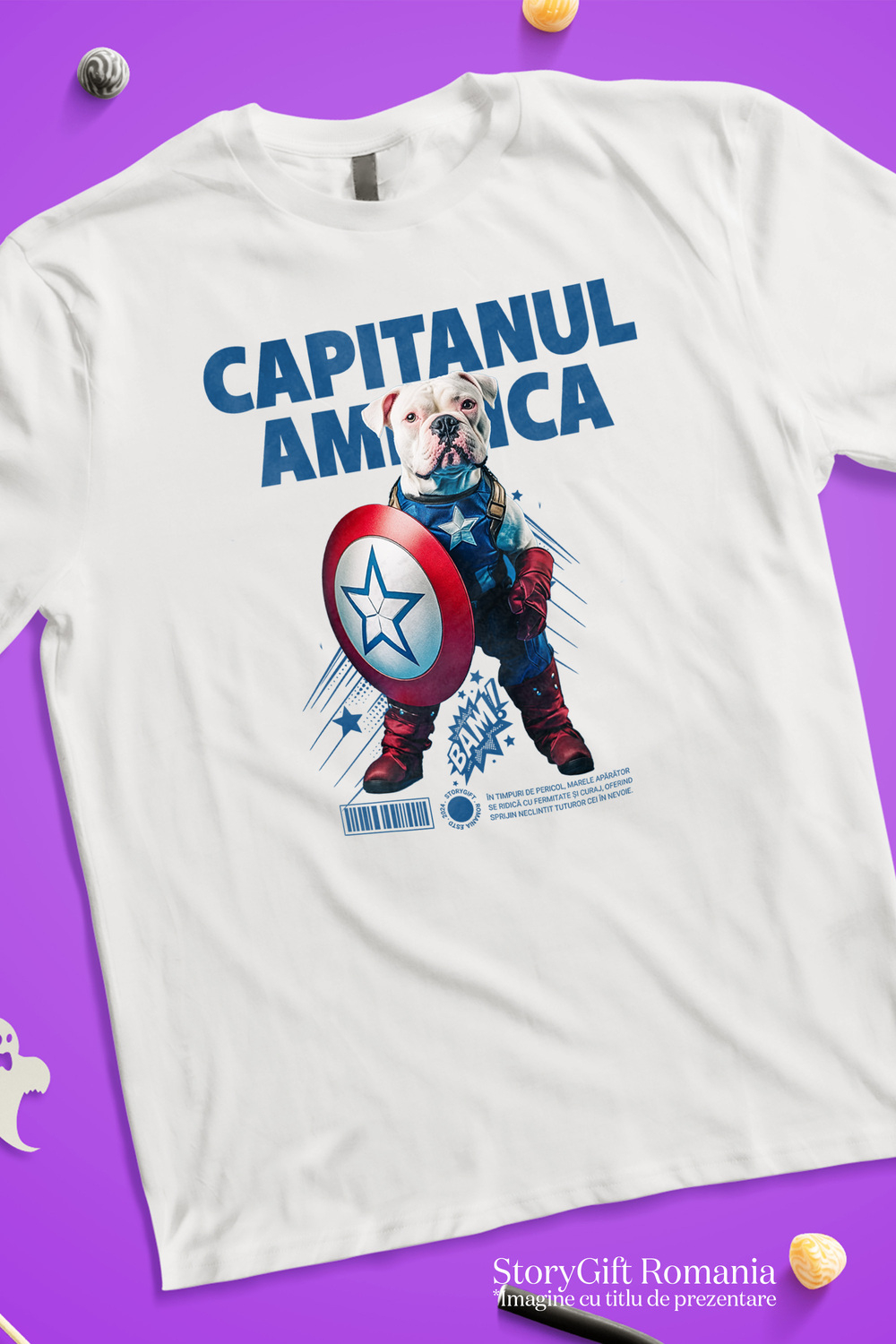 Tricou Copii cu Animal Capitanul America, Peronalizata cu Numele si Poza Animalului Tau cu imprimeu pe Fata, 100% Bumbac, Alb, 8 Ani