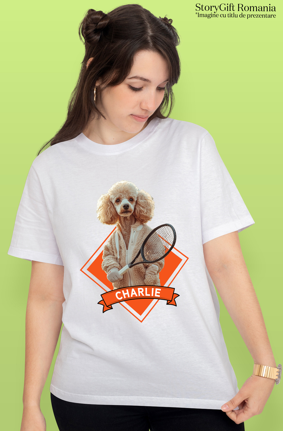 Tricou Femei cu Animal Jucator de Tenis, Peronalizata cu Numele si Poza Animalului Tau cu imprimeu pe Fata, 100% Bumbac, Alb, S