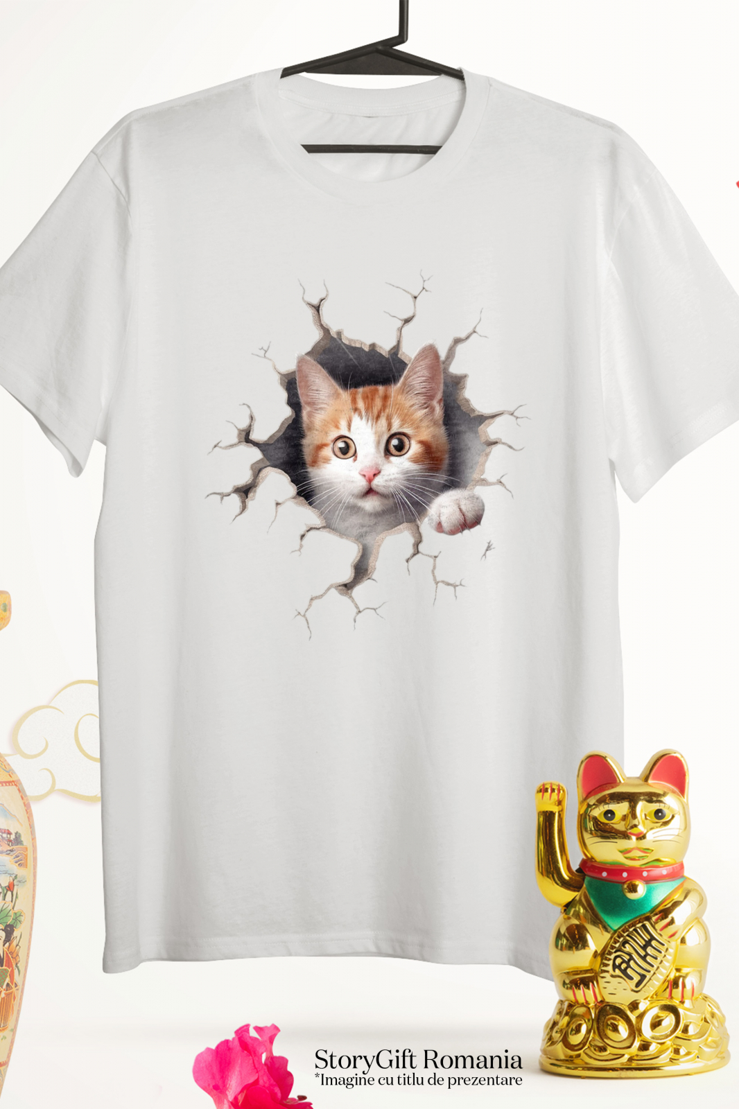 Tricou Femei Cu Pisica cu Portocaliu si Alb Care iese din Zid, Adorabil, Animale, Iubitorii de Pisici cu imprimeu pe Fata, 100% Bumbac, Alb, XL