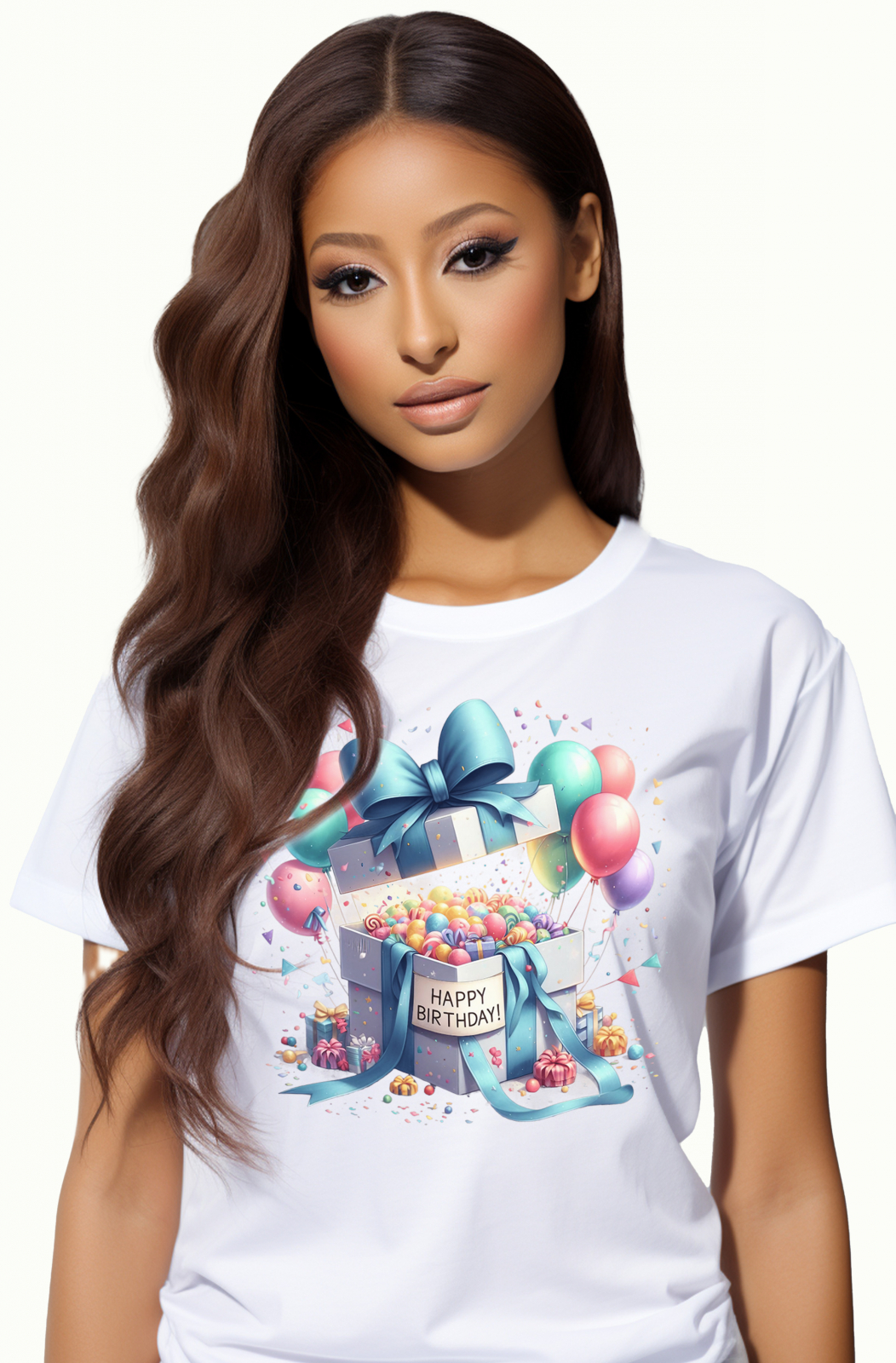 Tricou Femei cu un cadou deschis cu mesajul ""Happy birthday"", ilustratie, multe bomboane si baloane, la multi ani, fericire, aniversare, cu imprimeu pe Fata, 100% Bumbac, Alb, XS